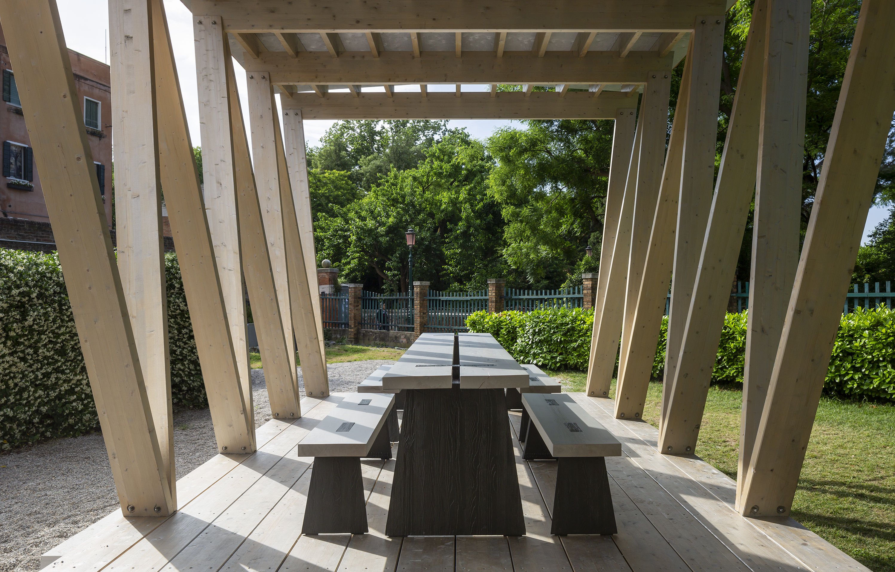在双年展上展出的凉亭Loggia d’Ombra,主要材料为赤松。凉亭的设计灵感来自瑞典的经典舞亭。建筑设计公司In Praise of Shadows与瑞典木业协会、建筑开发商Folkhem、木材供应商Martinsons和Moelven以及家具品牌Källemo合作完成了这件展品。