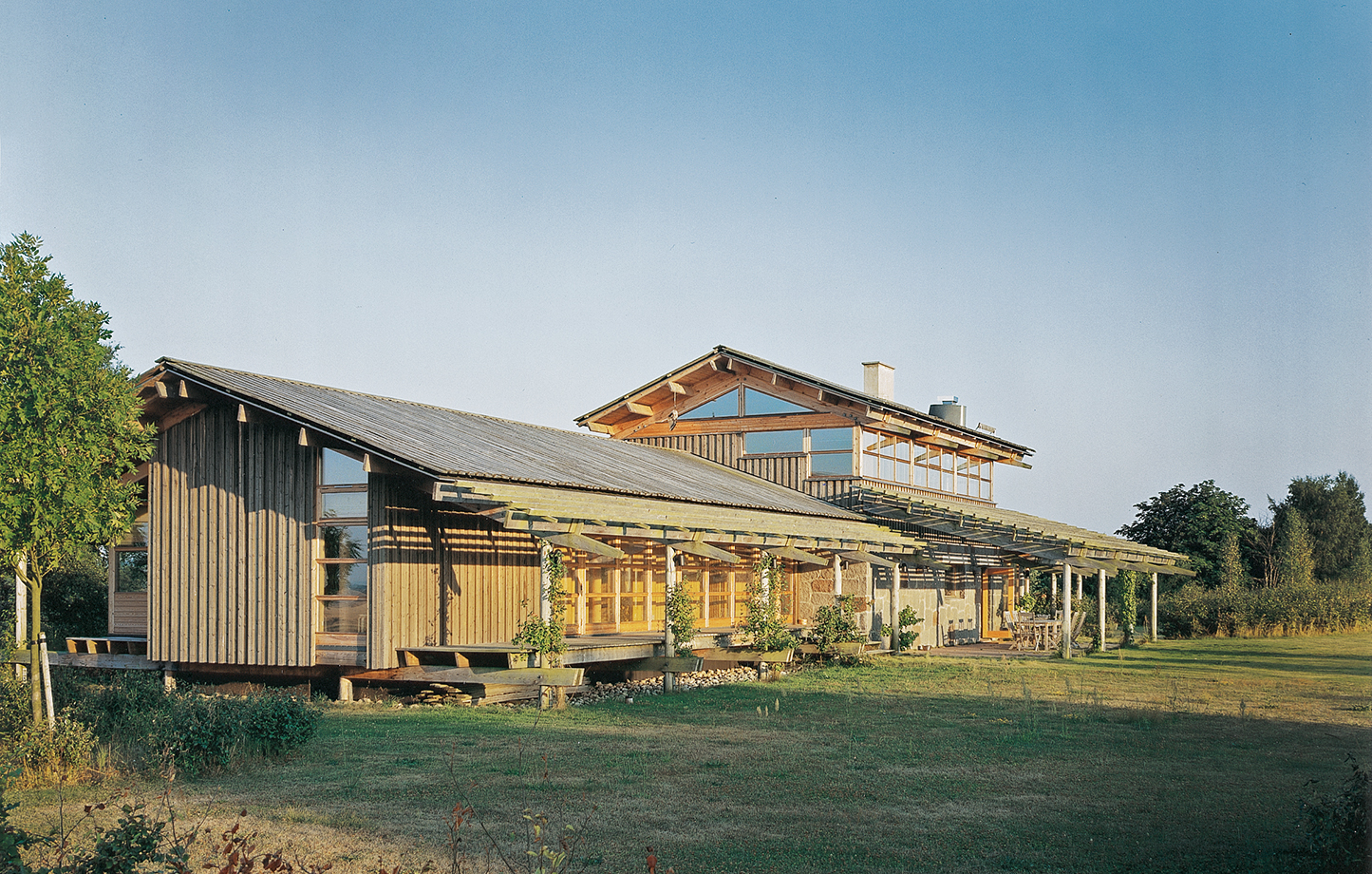 这是一间带有美国西海岸建筑风格的牧场主乡村民居。木屋成熟、坚定且不妥协,豪放却美丽地坐落在开阔的农场中。开阔的环境提供了充足的原材料,解释了房屋夸张地扩张到外墙之外的原因。坚固耐用的室内设计虽然令人惊喜,却与大手笔使用大量木材的室外达成了一致。