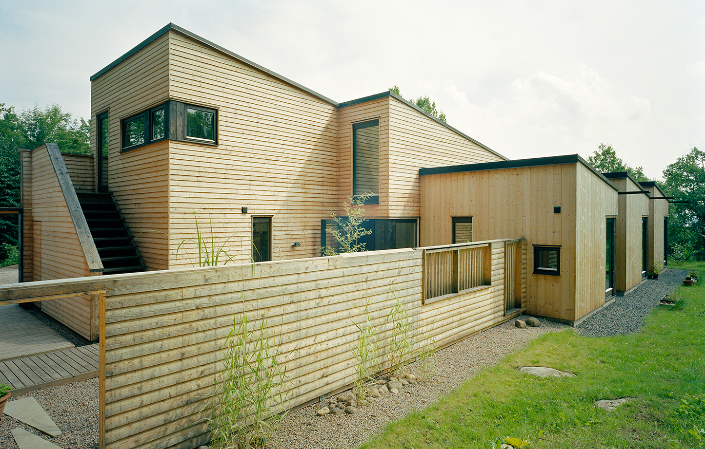 别墅沿着等高线安置,室内则随着地面的起伏而装饰。斜坡在建筑微微倾斜的屋顶得到体现,展现出独特的形态。楔状的主楼由三个小方体房间组成,其中包括卧室。房子布局像正交式城市规划,每个房间及外部景观都在轴线上,甚至日式迷你入口式花园也遵循这种结构。别墅整体大量使用木材,室内墙面和天花板使用桦木胶合板,外墙使用木焦油处理的云杉板。