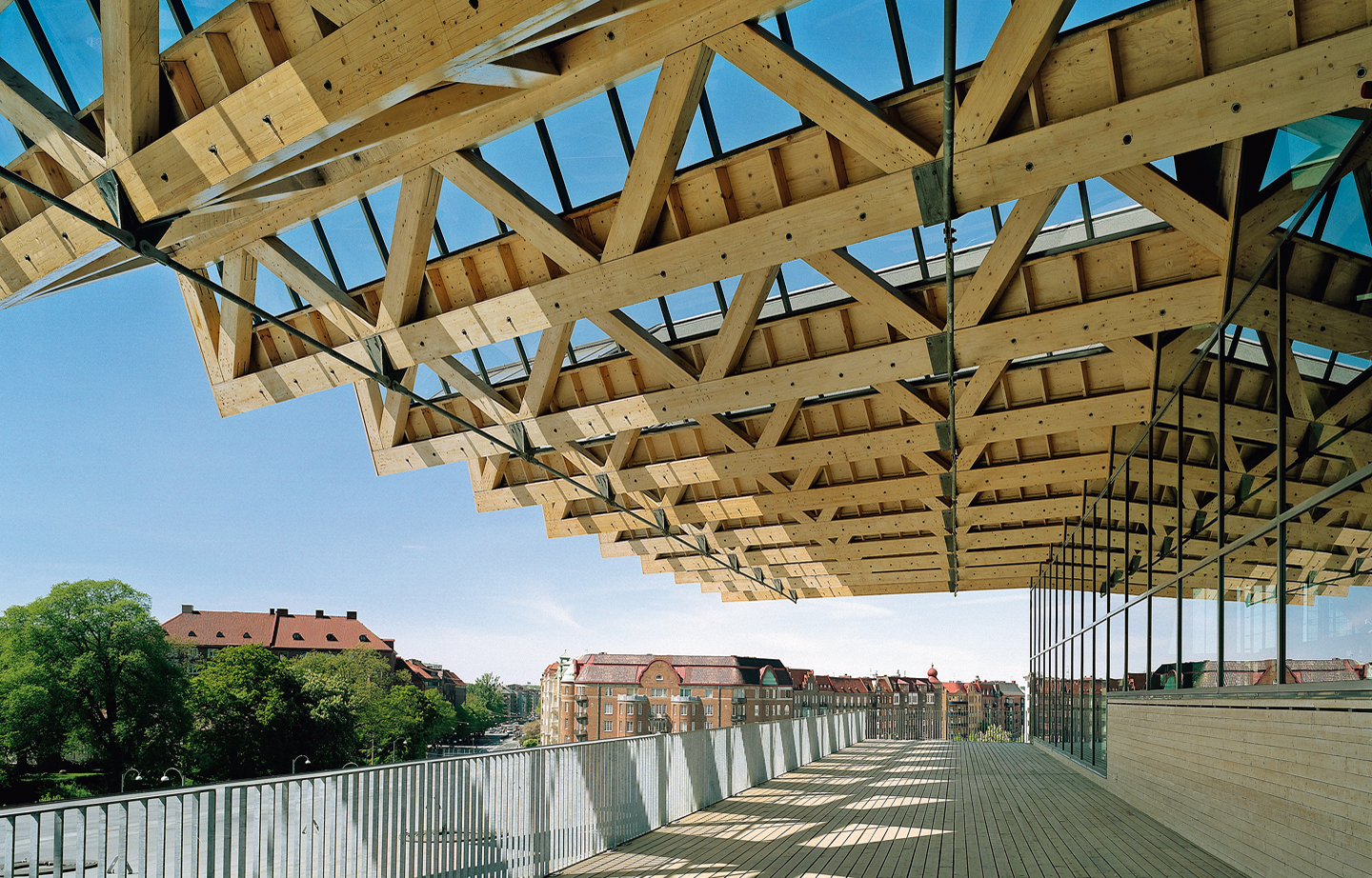 Universeum科学中心的入口处建筑结构可以称为瑞典最壮观的木建筑。此建筑结构清楚地展现了木材也可以构造大型建筑结构的可能性。木材在此的大幅度、不限制使用显示出了探索极限的精神。大胆突出的承重结构和与玻璃及塑料结合的外墙结构是建筑的外观特点,入口处强有力的支柱结构带来极佳的室内设计感。
