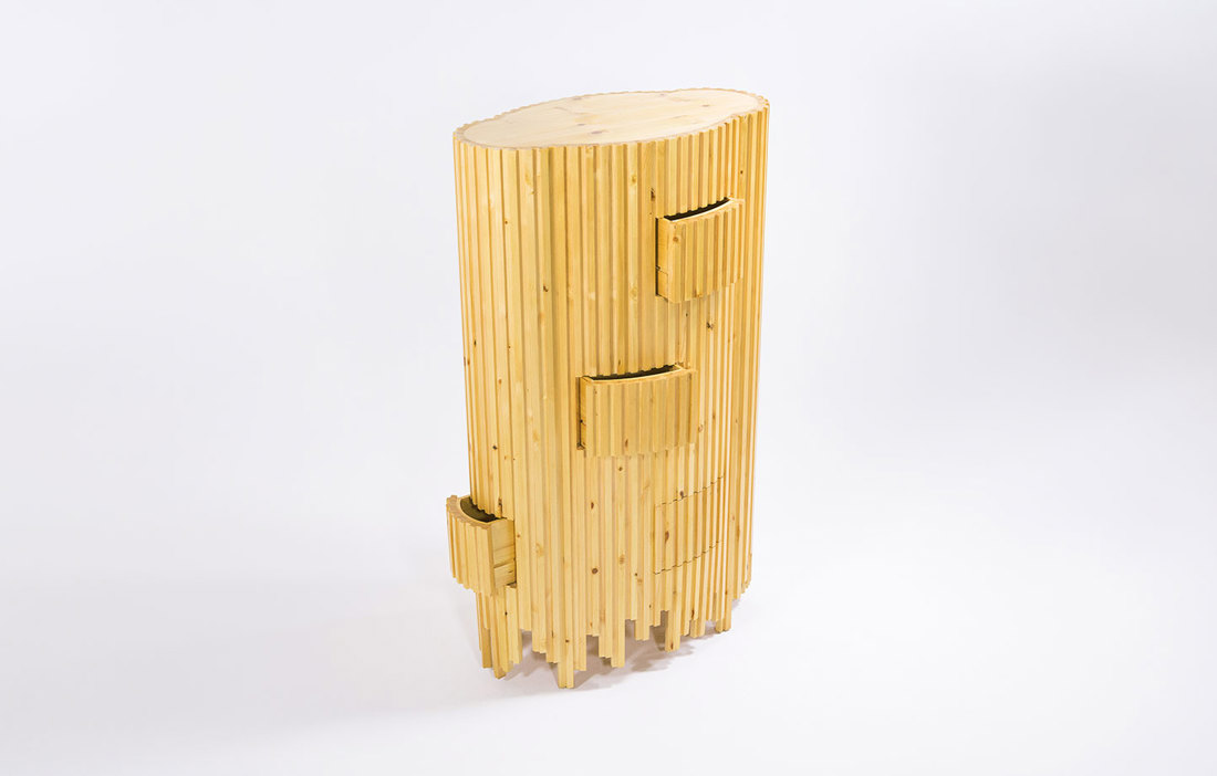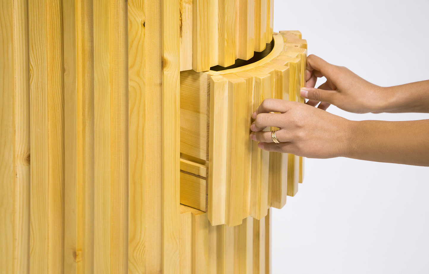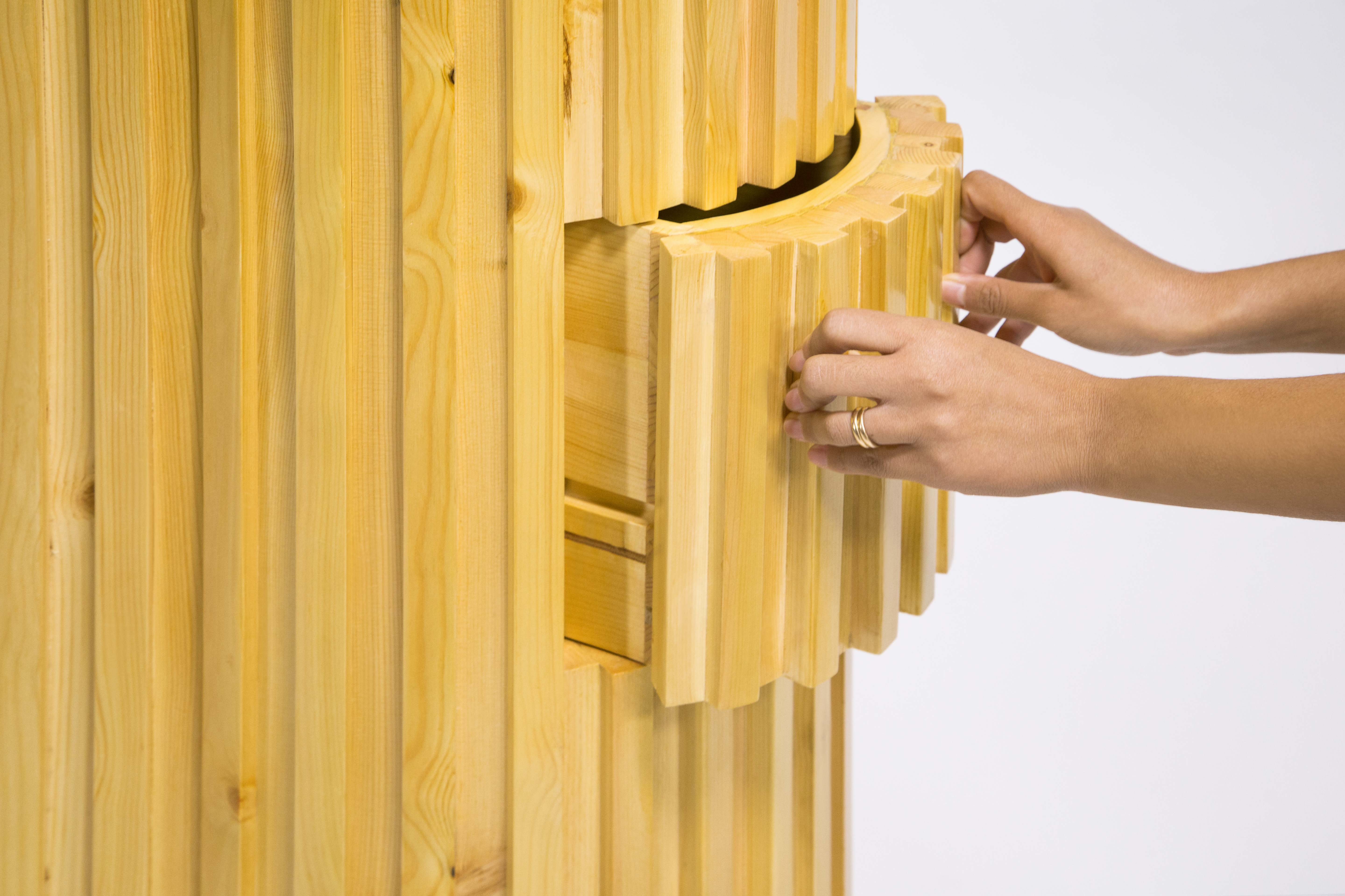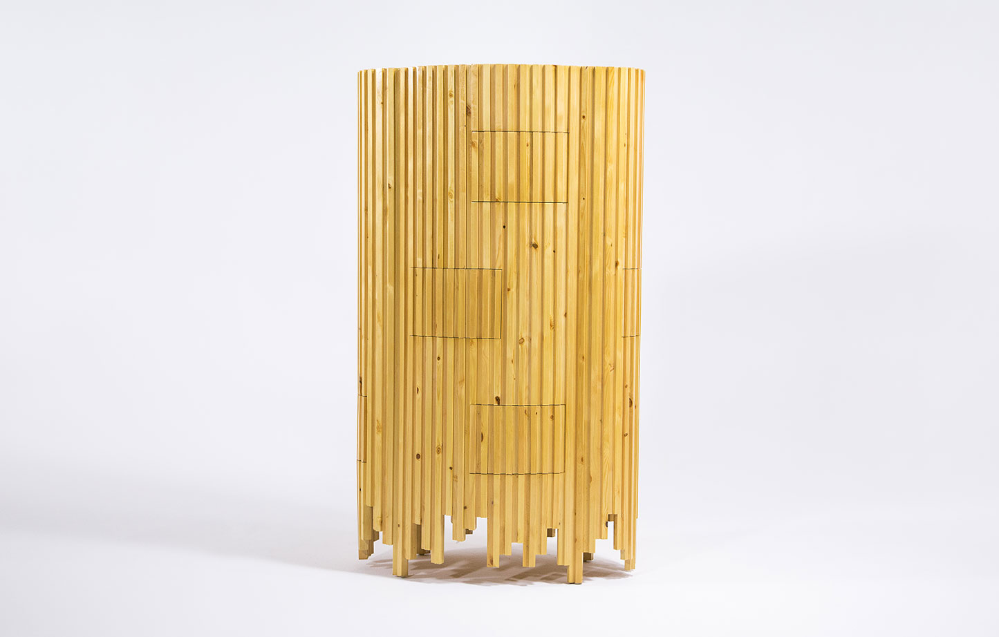 陈燕飞对赤松的个人体验 是:易于加工,可塑性强, 性能稳定,天然环保。他大 胆设计了一个多曲面梅花形 的柜子。柜子不分前后左右 关系,四周高低错落“生长 出”很多抽屉,合上的抽屉 则完全隐藏在柜子中。立面 上,作品隐约体现了中国传 统山水画的神韵。